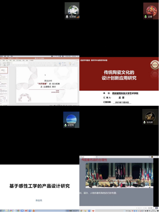 孟蕾老师为大家带来的《传统陶瓷文化的设计应用转化》、陈金亮的《基于感性工学的产品设计研究》、张向辉的《重大历史题材油画创作:公元一千九百四十五年九月九日九时•南京》都为大家展示了老师们在学术研究方面的丰硕成果。