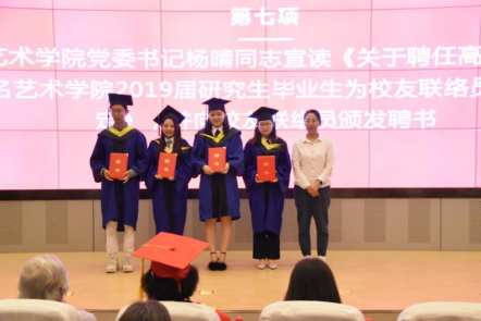 Ray竞技官网党委书记杨晴同志宣读《关于聘任4名Ray竞技官网2019届研究生毕业生为校友联络员的决定》并为其颁发聘书。