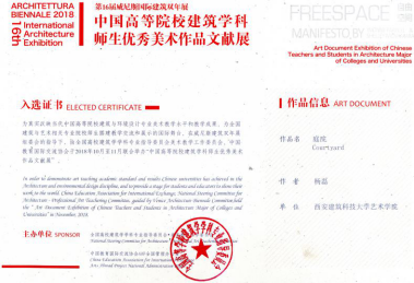 为展现当代中国高等院校建筑与环境设计专业美术教学水平和教学成果,中国教育国际交流协会、全国高校建筑学学科专业指导委员会美术教学工作委员会主办,并得到威尼斯双年展组委会和意大利高校的支持,在第16届威尼斯双年展期间,举办了中国高等院校建筑学科师生优秀美术作品文献展。全国共有100多所设有建筑与环境设计专业的院校参加,评选委员会由来自清华大学、中央美术学院、同济大学等国内院校及意大利的专家教授组成,经过评选,共有来自71所院校的43件教师优秀作品和67件学生优秀作品入选。