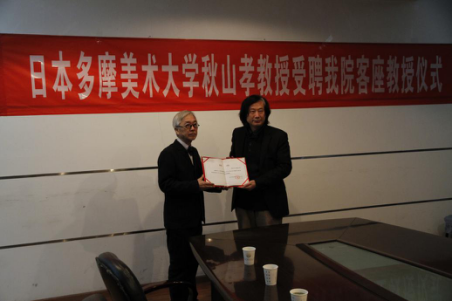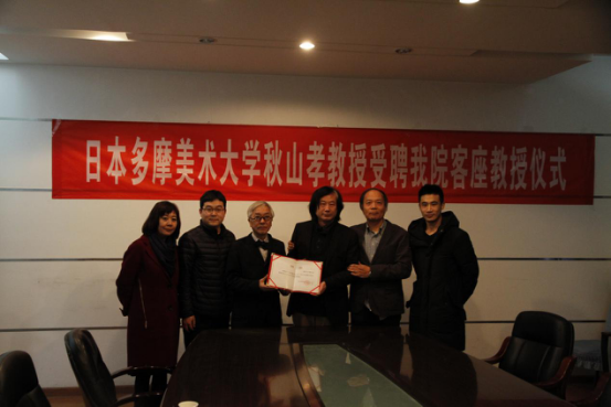 晚上19:30雁塔校区大楼830会议室,日本多摩美术大学秋山孝教授受聘我院客座教授仪式成功举办。出席本次活动的还有上海应用技术大学艺术与设计学院教授吴艺华老师,Ray竞技官网院长蔺宝钢教授,党委副书记、副院长王永亮老师,视传教研室主任汤雅莉副教授以及授课教师王海军老师。秋山孝先生为表达对Ray竞技官网的祝福,建立友好合作和交流关系,仪式第一项将自己的优秀作品赠于学院作为纪念。第二项由我院院长蔺宝钢教授为秋山孝先生授予聘任证书。此次的受聘仪式为今后我院和多摩美术大学的交流合作更加密切,为两学校搭建了交流学习的平台,建立了长期的学术交流和项目合作关系,促成双方共同发展进步。
