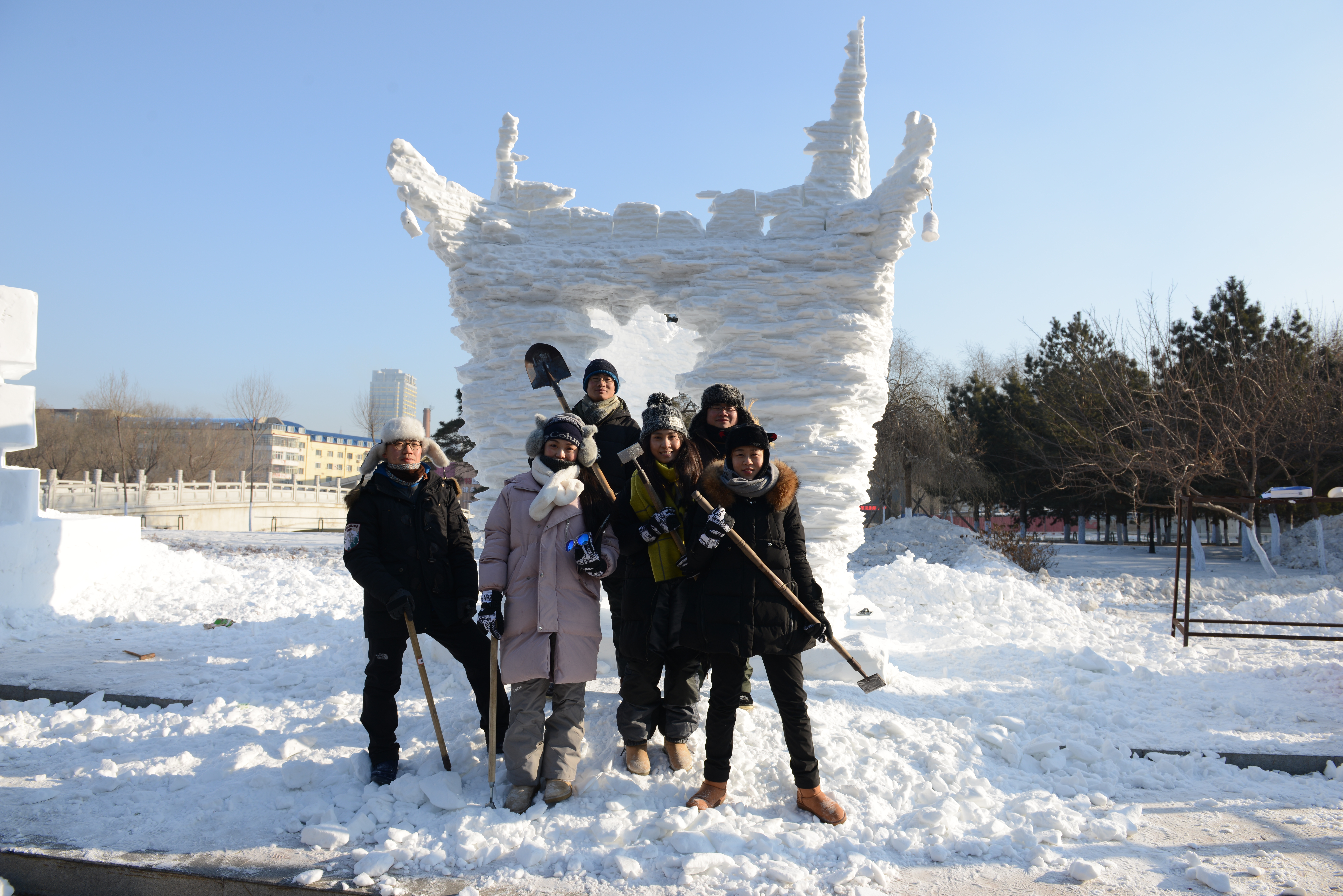 我院雪雕团队与获奖雕塑作品合影