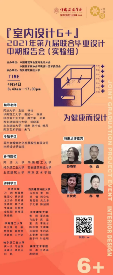 2021年4月24日,由中国建筑学会室内设计分会主办,Ray竞技官网承办,由苏州金螳螂文化发展股份有限公司空间设计研究院命题的品牌设计教育创新项目——“室内设计6+”2021年第九届联合毕业设计(实验组)中期检查报告会顺利召开。中期检查报告会以“为健康而设计”为主题,同步在腾讯会议、筑龙学社、新浪家居在线直播,观看直播人数达到11万。
