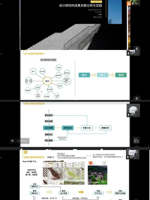 同时,不同专业及学科的老师都展示了在自身研究领域中的丰硕成果:孟蕾老师为大家带来的《传统陶瓷文化的设计应用转化》、陈金亮的《基于感性工学的产品设计研究》、张向辉的《重大历史题材油画创作:公元一千九百四十五年九月九日九时•南京》、王名峰的《西汉茂陵霍去病墓石刻与“马踏匈奴”研究讲座完美收官》关伟锋老师的《城址类大遗址历史动态层次展示设计方法研究》、张斌老师的《设计研究的成果关联分析与实践》、刘福龙老师的《公共艺术的场所精神》以及吕婧华、秦晓琳、李慧敏、张颖、张钧挥、杨冠楠、赵阳、张毛毛等多名老师都为大家展示了在学术研究方面的丰硕成果。