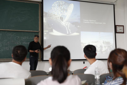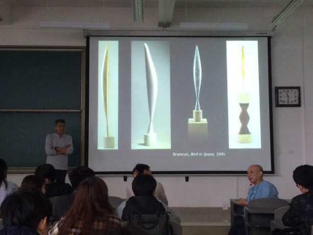 课程一开始比利·李(Billy Lee)教授向学生们系统地梳理西方抽象雕塑史,并向同学们解释了抽象艺术从何而来,为什么而来。介绍抽象雕塑在中西方艺术中的相似之处,而后着重分析了罗丹、毕加索、杜尚、贾科梅蒂、安迪沃霍尔、杰夫·昆斯等多位在19世纪50年代开始的雕塑艺术发展史上具有代表性的艺术家及其作品。还归纳了抽象雕塑来自于现代主义,给传统雕塑带来了一种新的雕塑语言,提出抽象雕塑创作的原则:空间(Space)、形状(Form)、重力(Gravity)、张力(Tension)、正负空间(NEG/POS)、比例(Proportion)、尺度(Scale)、对比(Contrast)等,强调艺术家要结合科学、技术与艺术,尝试和运用各种材料。在课上同学们不懂得地方朱尚熹老师还特别的做出了精彩的解释。在比利·李(Billy Lee)教授热情的讲解后,同学积极向比利·李(Billy Lee)教授提问并与老师进行了深入的交流。