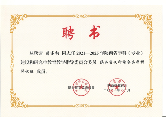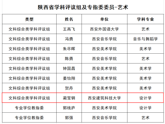 近日,我院蔺宝钢教授被陕西省学位委员会、陕西省教育厅聘请为陕西省学科(专业)建设和研究生教育教学指导委员会文科综合类学科——设计学学科评议组成员(设计学方向唯一人选)。