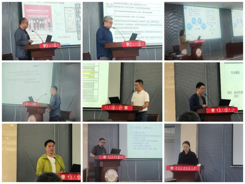 会议首先是9位专业负责人进行汇报交流,汇报内容包括:评估材料整理进度、专业特色凝炼、专业建设成效,以及自评自建中遇到的问题和相关整改措施。