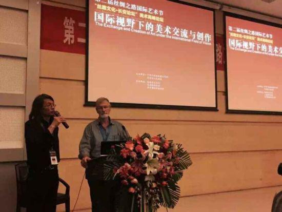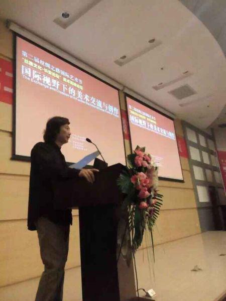 9月19日上午,在高峰论坛主旨发言中,著名文化学者肖云儒在演讲中提出了对丝绸之路艺术国际化路径的看法,并表示,丝绸之路让世界相识相知,丝绸之路把中亚文化连为一体。德国策展人莱纳·亨策与艺术系学生互动交流,爱沙尼亚策展人劳特·乔克达现场展现国外艺术家的优秀作品,为大家带来了丰富的文化精神大餐。