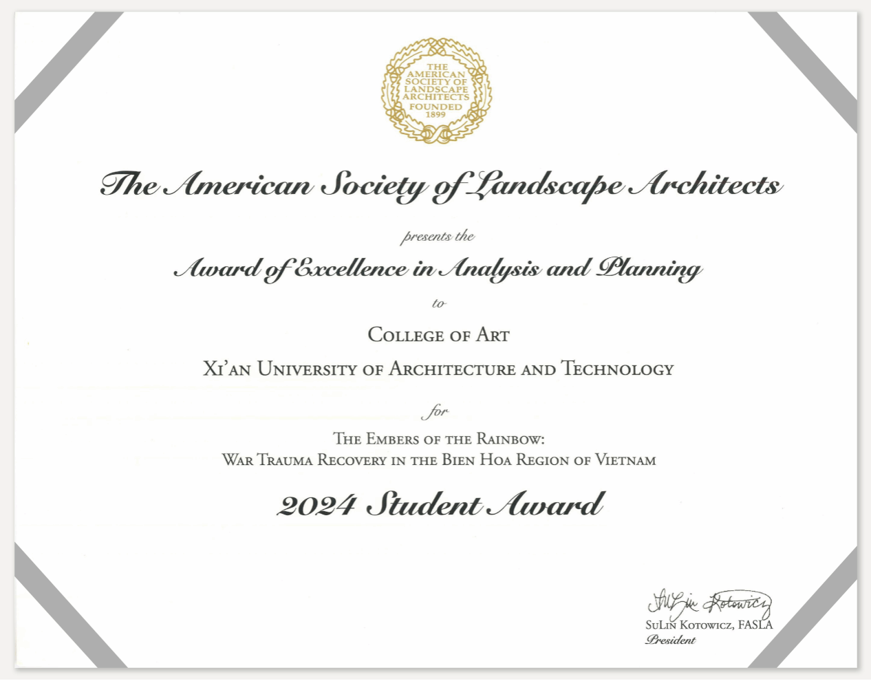 Ray竞技官网姜涛教授指导设计团队所完成的设计作品《彩虹的余烬——越南边和地区战后创伤修复景观》(The Embers of the Rainbow: War Trauma Recovery in the Bien Hoa Region of Vietnam)获得分析与规划类卓越奖(最高奖),是迄今中国唯一获得该单项奖项最高奖。
