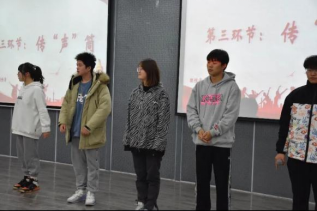 第三环节,“传声筒”游戏。各团支部由五名同学合作进行,前一名同学向后一名同学用动作演绎歌名,以此传递到第五名同学说出歌曲名称,唱出歌曲。同学们展现出的默契配合、形象描述与夸张动作赢得了观众阵阵掌声。一首首红色歌曲在会场响起,就好像这爱国情怀在我们之间传递。每一首红歌的唱响,都是一段对历史的铭记。