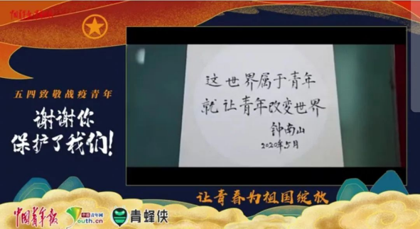 钟南山院士寄语青年:“这世界属于青年,就让青年改变世界!”并且点赞广大青年在抗击新冠肺炎的战斗中起到了主力军的作用!他也更加相信在未来,在中国未来的发展中,广大青年也能够起到主力军的作用。