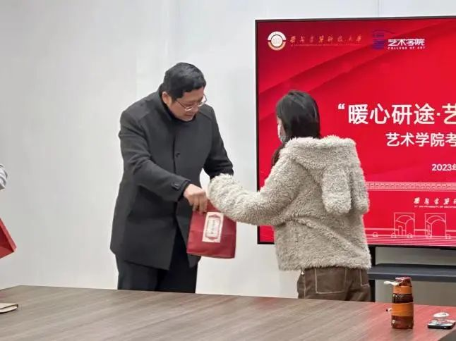 最后,学院为考研学生发放了“考研大礼包”,礼包外包装印有“艺齐上岸”字样,饱含学院对考研学子的美好祝福,希望这份礼物能为全体考研学子温暖护航,化为学子们前进力量。